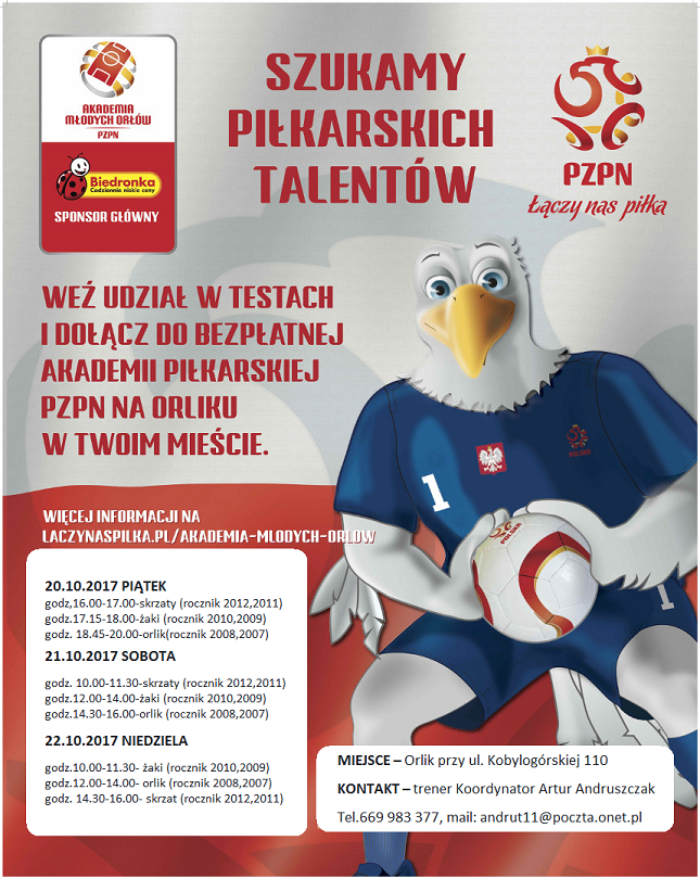 Polski Związek Piłki Nożnej oraz mistrz Europy Artur Andruszczak ma zaszczyt zaprosić wszystkie dzieci w wieku od 6-11 lat na Dni Talentu , które odbędą się dnia 20-22.10.2017 w Gorzowie Wlkp na boisku przy szkole podstawowej nr.4 ul. Kobylogórska 110.
