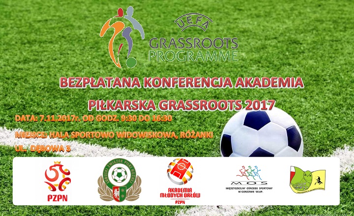 zapraszają  na bezpłatną kursokonferencję szkoleniową GRASSROOTS wszystkich nauczycieli WF, trenerów, instruktorów, studentów oraz wszystkie osoby, które interesują się piłką nożną.   Główny temat zajęć teoretycznych i praktycznych dot. będzie  popularyzacji oraz upowszechniania piłki nożnej wśród dzieci.  W trakcie konferencji poruszona zostanie również tematyka AmpFutbol, odżywania w sporcie oraz profilaktyki  kontuzji w piłce nożnej. Prelegentami będą przedstawiciele Polskiego Związku Piłki nożnej oraz Trenerzy reprezentacji młodzieżowych naszego kraju.