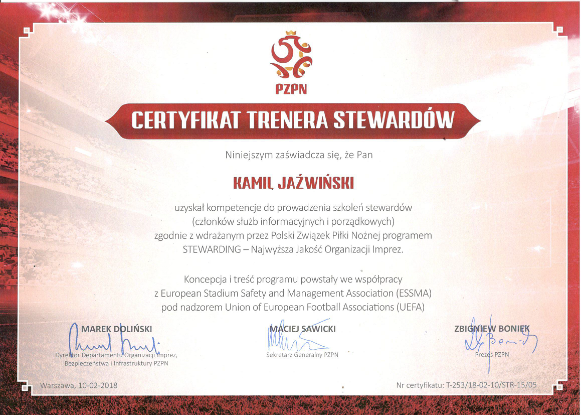 Certyfikat nadany przez Polski Związek Piłki Nożnej uprawnia do prowadzenie szkoleń stewardów (członków służb informacyjnych i porządkowych) zgodnie z wdrażanym przez PZPN programem „STEWARDING – Najwyższa Jakość Organizacji Imprez”