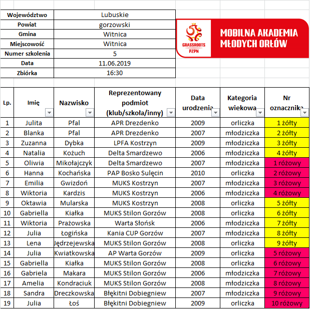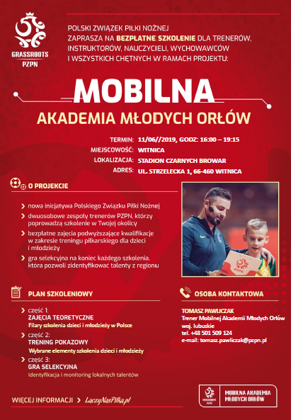 Polski Związek Piłki Nożnej zaprasza na BEZPŁATNE SZKOLENIE dla trenerów, instruktorów, nauczycieli i wychowawców w ramach projektu Mobilna Akademia Młodych Orłów. Najbliższe szkolenie odbędzie się 11 Czerwca 2019 roku w Witnicy. Poniżej przedstawiamy szczegółowe informację oraz listę powołanych zawodniczek.