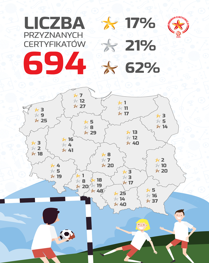Dnia 29 listopada Polski Związek Piłki Nożnej ogłosił listę szkółek, którym przyznane zostały Certyfikaty PZPN. Decyzją Komisji Weryfikacyjnej oraz Komisji Odwoławczej ds. Certyfikacji PZPN dla szkółek piłkarskich odznaczone zostały 694 podmioty z całego kraju: 117 otrzymało złoty certyfikat, 145 srebrny, a 432 brązowy.