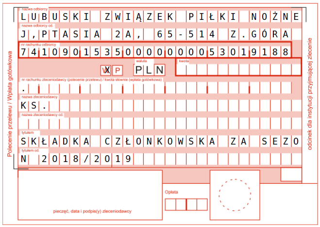 Okręgowy Związek Piłki Nożnej w Gorzowie Wlkp. przypomina o konieczności uiszczenia składki członkowskiej na sezon 2018/19. Kluby zależnie od klasy rozgrywkowej odpowiednią kwotę wpłacają na konto Lubuskiego Związku Piłki Nożnej. Termin opłaty upływa z dniem 30 Czerwca 2018 roku. Po dokonaniu wpłaty potwierdzenie przelewu należy przesłać na adres email Ten adres pocztowy jest chroniony przed spamowaniem. Aby go zobaczyć, konieczne jest włączenie w przeglądarce obsługi JavaScript.. Druk do pobrania poniżej.