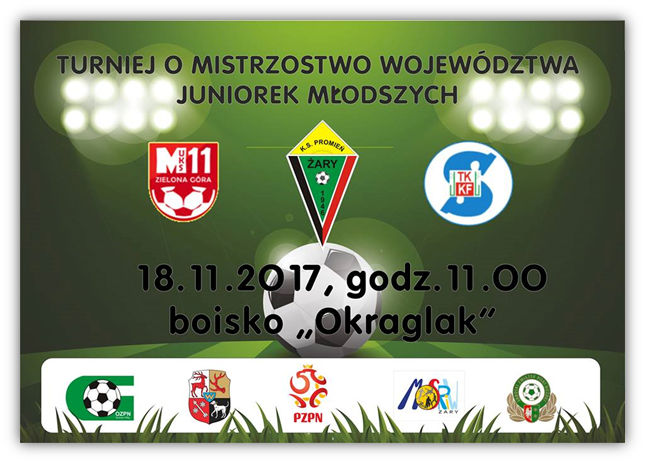 W dniu 18 Listopada w Żarach zostanie rozegrany turniej juniorek młodszych o tytuł mistrza województwa Lubuskiego. Przewidywany start na godzinę 11:00, rywalizować będą trzy zespoły MUKS 11 Zielona Góra, TKKF Stilon Gorzów oraz Promień Żary. Wszystkich sympatyków piłki nożnej zapraszamy do Żar w podanym terminie.